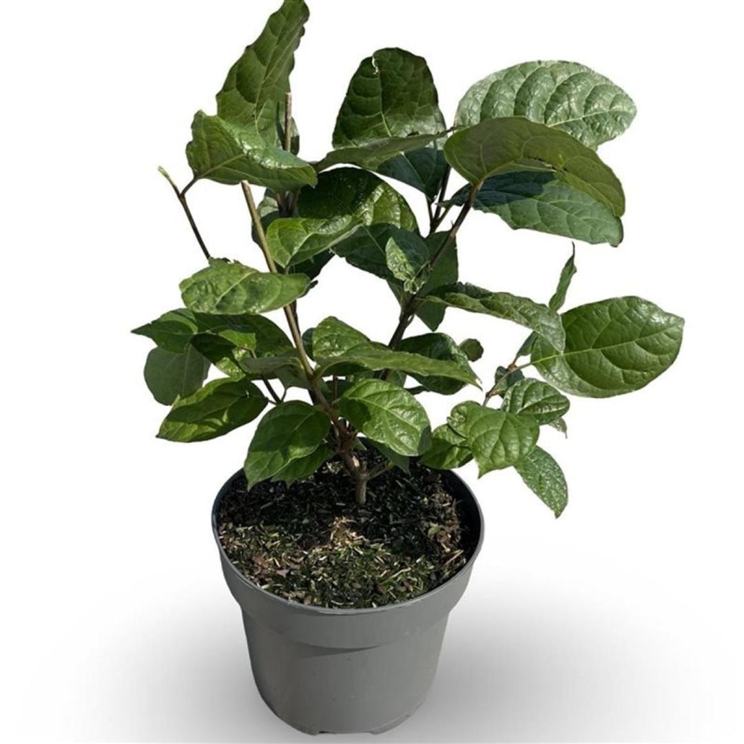 Hybride heester met grote, wijnrode bloemen en glanzende, groene bladeren.