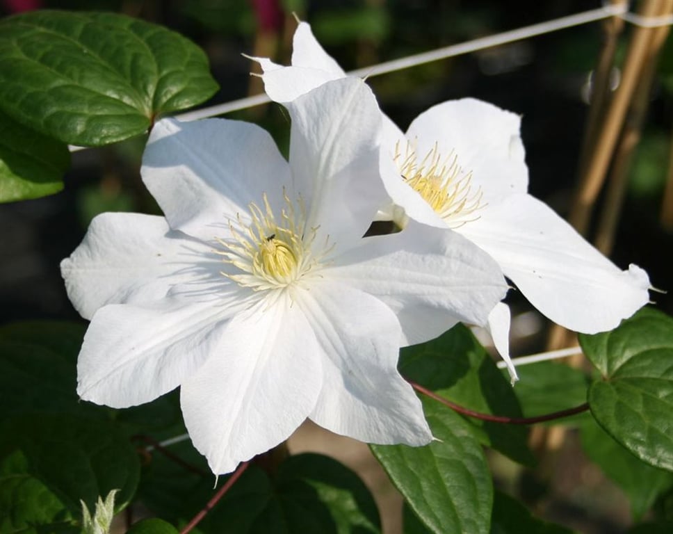 Bladverliezende klimplant met grote, zuiver witte bloemen en prominente gele meeldraden. Ideaal voor pergola's en trellissen.