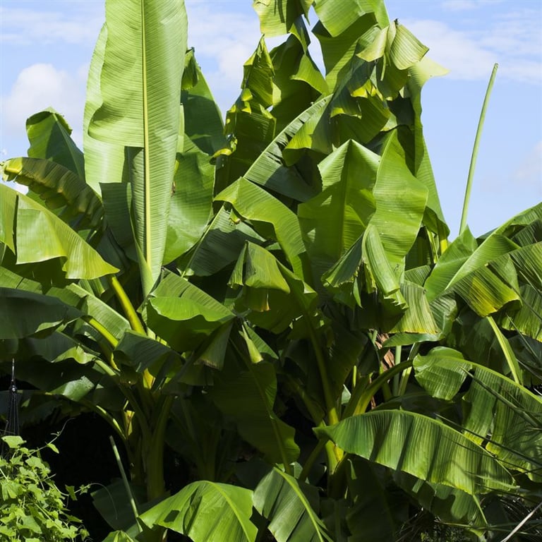 Winterharde banaan met groene bladeren. Vorstbescherming nodig.