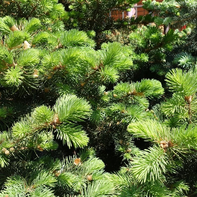 Slanke groei, korte groene naalden, witte strepen aan de onderkant.